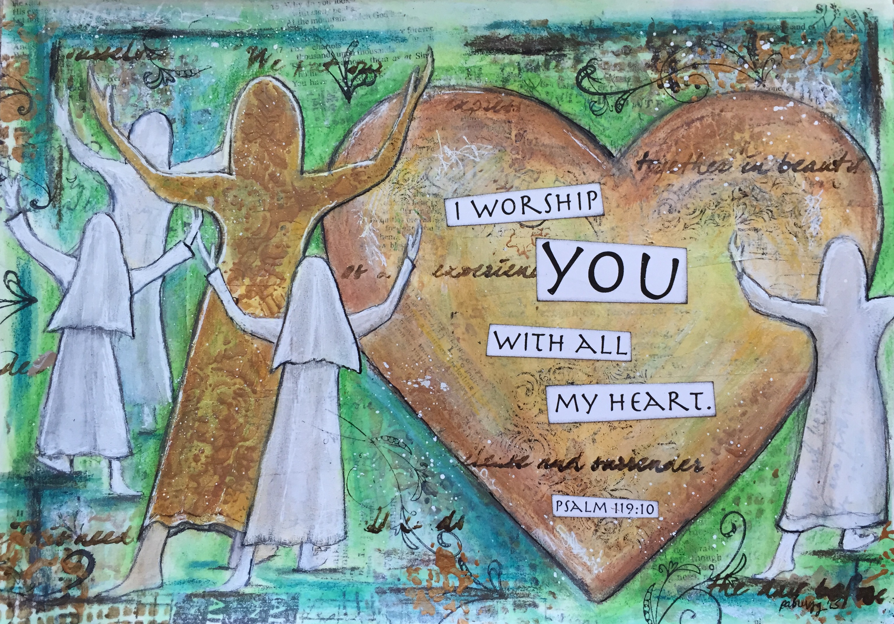 This year, I joined a group of Christian artists from around the world at His Kingdom Come to worship God through visual arts expression. (Actually I should also mention that His Kingdom Come is offering an on-line grief/art class entitled, “Good Grief” available from fellow HKC artist, Kathy Shaull.) Anyway, it’s not easy to worship Him when your heart is shattered. I soooo know. But I’ve discovered that doing so somehow shift my perspective off my painful grief and onto God’s glorious hope.